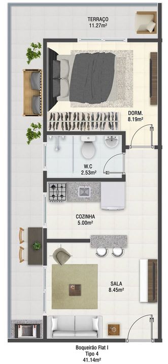 Imóvel (41,14 metros úteis) conta com 01 dormitório, sala e cozinha integradas, terraço no entorno do imóvel, banheiro e 01 vaga de garagem.