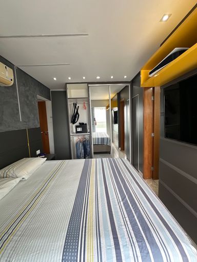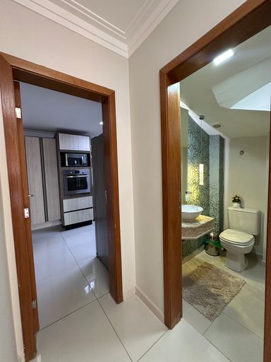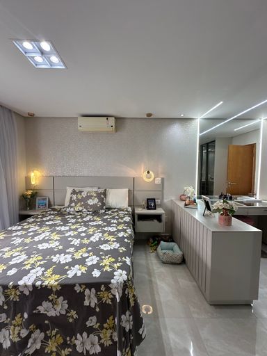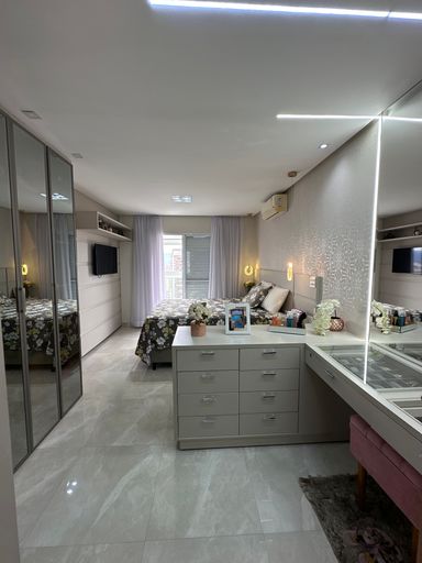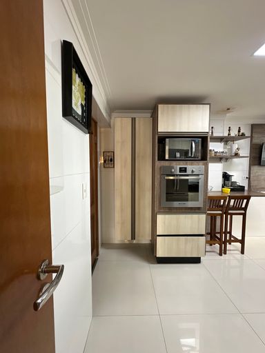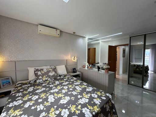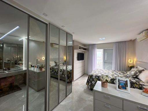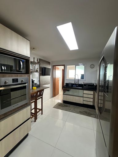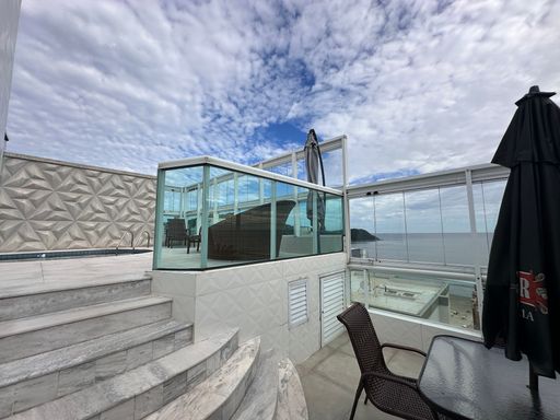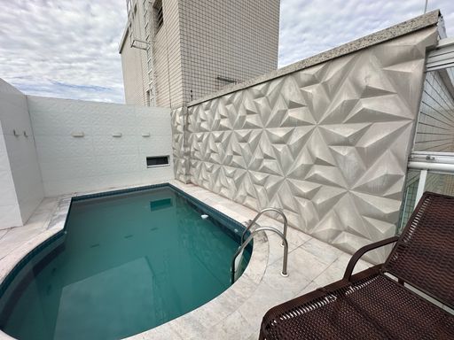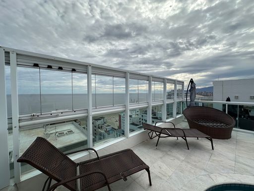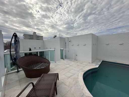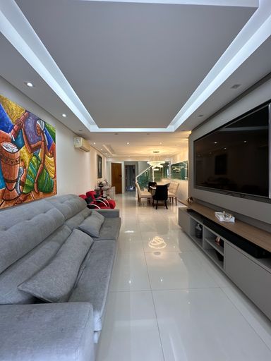 Com 340 m² de área útil, a cobertura conta com quatro suítes, dependência para empregada com banheiro, sala para dois ambientes e três vagas de garagem demarcadas. A sala principal possui televisão de 80 polegadas e as suítes contam com televisores de 43 polegadas. A cozinha está equipada com geladeira side by side, agregando funcionalidade e elegância ao ambiente.